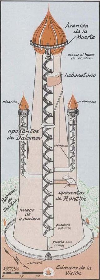 Aunque la biblioteca es un vasto edificio, apenas tenemos detalles de su interior[3]. Las fachadas y el interior del edificio están construidos con mármol y una escalera conduce a la puerta acristalada de la entrada[4]. La característica principal de la construcción son las inmensas salas repletas de estanterías con miles de rollos de pergaminos y de libros. En el centro hay escritorios iluminados por velas o por la luz que penetra por ventanas[5]. También se han descrito otras tres habitaciones más pequeñas: el estudio de Astinus, su residencia y la alcoba ocupada por Raistlin. El estudio, adyacente a la biblioteca, tiene estanterías abarrotadas de libros, un gran escritorio y una alfombra[6]. Crysania fue conducida a los aposentos privados de Astinus, ubicados en el ala oeste. Fue introducida en una habitación repleta de libros, apenas amueblada con unas cuantas sillas, una chimenea, una pulida mesa baja próxima a la ventana orientada al oeste y una máquina del tiempo alimentada por agua que estaba en un rincón[7]. El cuarto utilizado por Raistlin era aún más pequeño y austero[8].