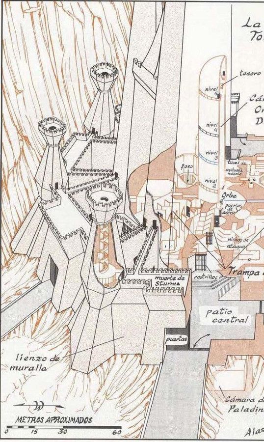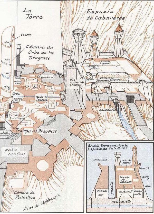La peculiaridad que hace única en su género esta construcción está en el primer nivel: la Trampa de Dragones[11]. En una de sus correrías nocturnas por el recinto, Tas se metió a hurtadillas en la Torre y observó que el corredor estaba flanqueado por «extrañas columnas… como ristras de dientes», y se dividía en tres secciones separadas por rastrillos[12]. Los primeros dos rastrillos caen para cerrarse, pero el tercero lo forman dos mitades que se unen dejando en el centro un amplio hueco. Más adelante, unas puertas de acero impiden el acceso a la gran sala central: la Cámara del Orbe[13]. Otros dos corredores idénticos desembocan en la estancia y su tamaño es lo bastante grande como para que entre el dragón atraído por la llamada del Orbe mientras los caballeros escondidos en los nichos que lo jalonan a ambos lados dan muerte a la criatura[14].