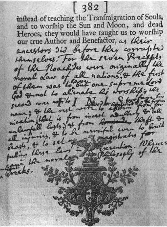Anotaciones de Newton enumerando los «Seven precepts of the Noachides» al final de su ejemplar de la Opticks (edición de 1717, Colección Babson, Burndy Library, MIT).