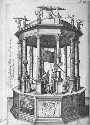 El gran mural astronómico, pintado en el observatorio de Uraniburgo, para medir las altitudes a las que los cuerpos celestes cruzaban el meridiano. En él aparece Tycho Brahe. Lámina de Astronomiae instauratæ mechanica (1602).