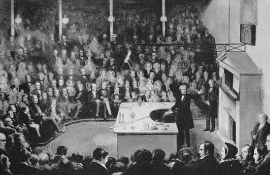 Faraday pronunciando una conferencia en la Royal Institution ante el Príncipe Consorte y el Príncipe de Gales.