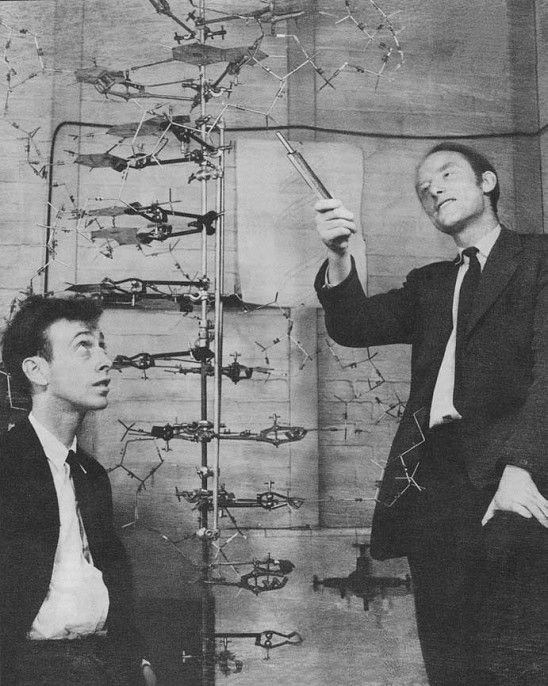 James Watson y Francis Crick fotografiados el 21 de mayo de 1953 por Antony Barrington Brown en el Laboratorio Cavendish ante un modelo tridimensional de ADN.
