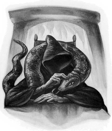 Una enorme serpiente apareció y trepó con lentitud por la silla de Voldemort; continuó subiendo (parecía interminable) y se le acomodó sobre los hombros. El cuello del reptil era tan grueso como el muslo de un hombre, y los ojos, cuyas pupilas semejaban dos rendijas verticales, miraban con fijeza, sin parpadear. El Señor Tenebroso la acarició distraídamente con sus largos y delgados dedos, mientras observaba con persistencia a Lucius Malfoy.