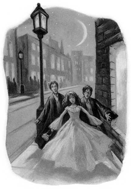 De modo que, bajo un cielo estrellado, echaron a andar —y a ratos corrieron— por una calle ancha y oscura, repleta de trasnochadores; las tiendas en ambas aceras estaban cerradas. Un autobús de dos pisos pasó rugiendo y un grupo de gente que salía de un pub miró a los tres jóvenes con extrañeza, porque Harry y Ron todavía llevaban las túnicas de gala.