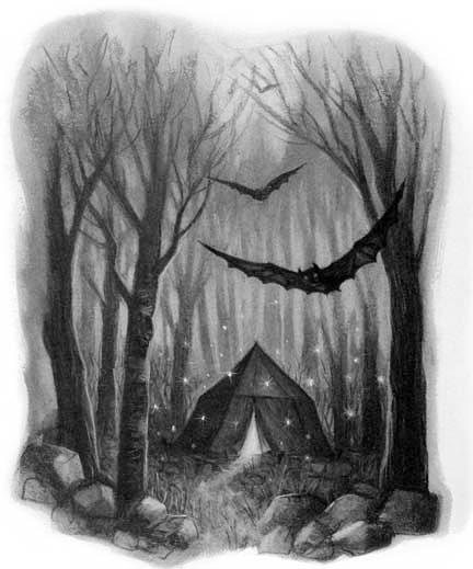 Tras colocar estratégicamente encima de la mesa el chivatoscopio que Hermione le había regalado por su cumpleaños, Harry y la joven pasaron el resto del día turnándose para vigilar el campamento. Sin embargo, el instrumento estuvo todo el rato quieto y silencioso, y ya fuera por los sortilegios protectores y los repelentes mágicos de muggles que Hermione había repartido por el claro del bosque, o porque la gente no solía ir por allí, la zona en que se habían instalado se mantuvo solitaria; lo único que vieron fueron algunos pájaros y varias ardillas. Al anochecer todo seguía igual; a las diez, cuando Harry fue a relevar a su compañera, encendió la varita y contempló un panorama desierto donde sólo unos murciélagos revoloteaban muy alto, cruzando el único trozo de cielo estrellado que se conseguía ver desde el protegido claro.