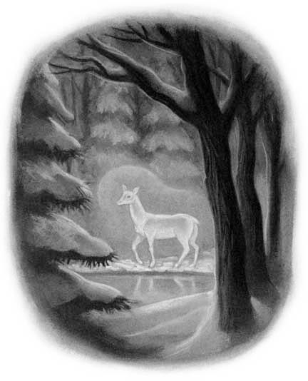 De pronto la fuente de la luz apareció por detrás de un roble. Era una cierva de un blanco plateado, reluciente como la luna y deslumbrante, que avanzaba sin hacer ruido y sin dejar huellas de cascos en la fina capa de nieve. El animal fue hacia él, con la hermosa cabeza en alto, y el muchacho distinguió sus enormes ojos de largas pestañas.