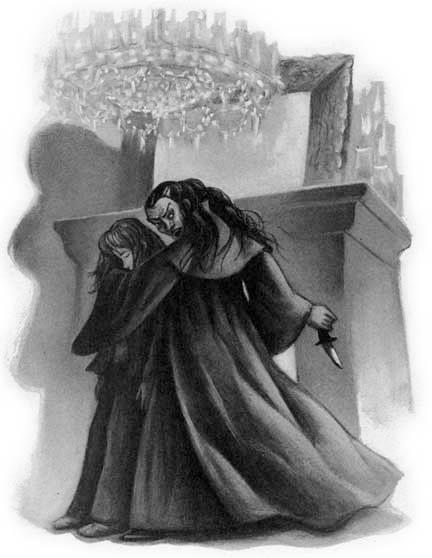 Mientras Narcisa arrastraba a Draco para ponerlo a cubierto, Bellatrix, con el pelo alborotado, se puso en pie empuñando el puñal de plata. De pronto Narcisa apuntó con su varita al umbral de la puerta.