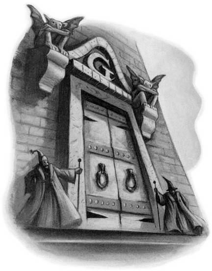 En medio del pasillo había un gigantesco dragón que impedía el acceso a las cuatro o cinco cámaras de los niveles más profundos de la banca mágica. Tenía las escamas pálidas y resecas debido a su prolongado encarcelamiento bajo tierra, y sus ojos eran de un rosa lechoso. En las patas traseras llevaba unas gruesas argollas cogidas a unas cadenas sujetas, a su vez, a unos enormes ganchos clavados en el suelo rocoso. Las grandes alas con púas, dobladas y pegadas al cuerpo, habrían ocupado todo el espacio si las hubiera desplegado. Cuando giró la fea cabeza hacia ellos, rugió de tal forma que hizo temblar la roca, y luego abrió la boca y escupió una llamarada que los obligó a retroceder a toda prisa por el pasillo.