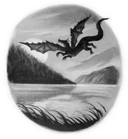 El aleteo de unas alas enormes resonó desde la otra orilla del lago: el dragón se había hartado de beber agua y había echado a volar. Los tres amigos interrumpieron sus preparativos y lo vieron remontarse cada vez más alto, una mancha negra contra un cielo cada vez más oscuro, hasta que desapareció detrás de una montaña cercana. Entonces Hermione se puso entre los dos chicos; Harry los cubrió con la capa, tiró de ella al máximo hacia abajo para taparse bien y, juntos, giraron sobre sí mismos y se sumergieron en la opresora oscuridad.