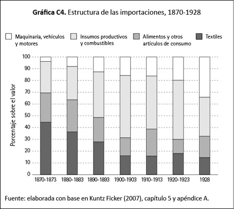 Las importaciones también crecieron (su valor aumentó 4.5% anual en promedio entre 1870 y 1925) y sobre todo modificaron su composición: los bienes de producción, que en 1870 representaban sólo 30% del total, llegaron a 70% a partir de 1900, convirtiéndose en el principal instrumento para la modernización económica y la industrialización. Las importaciones de maquinaria, el mejor indicador disponible de la formación de capital en el México de estos años, se multiplicaron por 110 entre 1872 y 1929, al pasar de 268 000 dólares en 1872 a 29.5 millones en 1929, con una tasa de crecimiento de 8.6% como promedio anual.